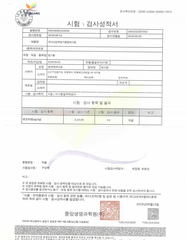 참기름 | 5월 국산 참기름 품질검사 시험성적서 페이지 정보 작성자 깨사랑 작성일16-07-21 16:28 조회1,968회 댓글0건 관련링크 이전글 다음글 검색 목록 본문 5월 국산 참기름 품질검사 시험성적서 댓글목록 등록된 댓글이 없습니다. 이전글 다음글 검색 목록