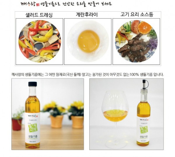 깨사랑에서 만드는 생들기름은 100% 국산 자연건조 들깨를 저온 압착하여 짠 생들기름을 이탈리아 고급 정제기 필터링 과정을 통해 투명하게 만들어진다. 매일 주문 들어온 양만큼을 착유 배송해 가정집 식탁에서 신선한 생들기름을 손쉽게 즐길 수 있어 그 신선함으로 높은 만족도를 기록하고 있다. 또한 위생적인 공장시설을 유지하고 소비자들에게 생산현장을 상세히 보여주고 있다.