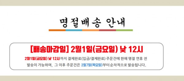 배송 | 설 명절 배송 마감 안내 입니다. 페이지 정보 작성자 깨사랑 작성일19-01-31 22:22 조회6,118회 댓글0건 관련링크 이전글 다음글 검색 목록 본문 안녕하세요. 깨사랑 입니다. 2019년2월1일(금요일) 13시 주문건 까지는 2월1일에 발송 해드리고 그이후 주문건은 2월7일(목요일)이후 순차 발송해드립니다. 궁금하신점은 깨사랑 T 1588-8678 문의주세요 댓글목록 등록된 댓글이 없습니다. 이전글 다음글 검색 목록