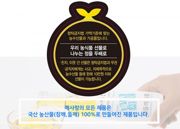 깨사랑의 모든 제품은 국산 농산물(참깨,들깨) 100% 제품으로
